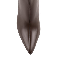Step into elegance with this timeless knee-high boot. Featuring a smooth vegan leather finish, a sleek pointed toe, and a slim stiletto heel, this style adds instant sophistication to any outfit. Designed for a snug and flattering fit, it pairs perfectly with everything from mini dresses to denim, making it a must-have for day-to-night dressing.